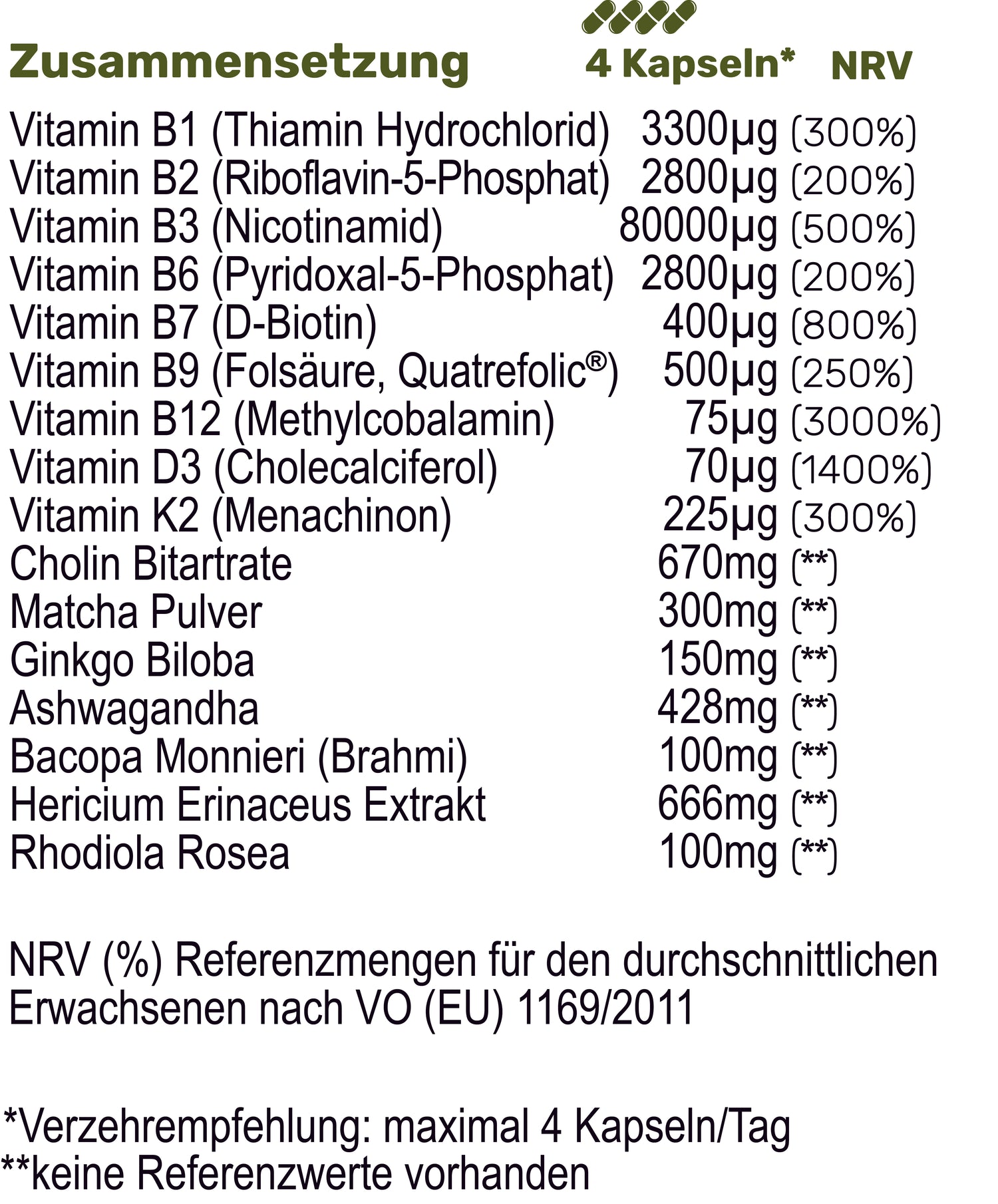 Die vegane Formel enthält unter anderem Ashwagandha, Matcha, Brahmi, Cholin, Ginkgo, Rhodiola Rosea, Hericium Erinaceus sowie einen umfangreichen Vitamin-B-Komplex und eine Vitamin-D3/K2-Kombination.